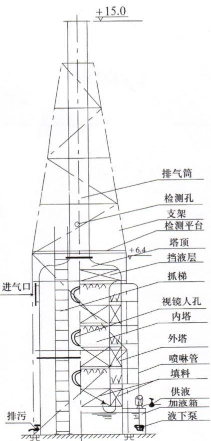 废气由风机送入上部进气口,先进入外塔进入初级处理经均散和初级净化后再迂回进入内塔,进一步净化处理,后经气液分离后排放。